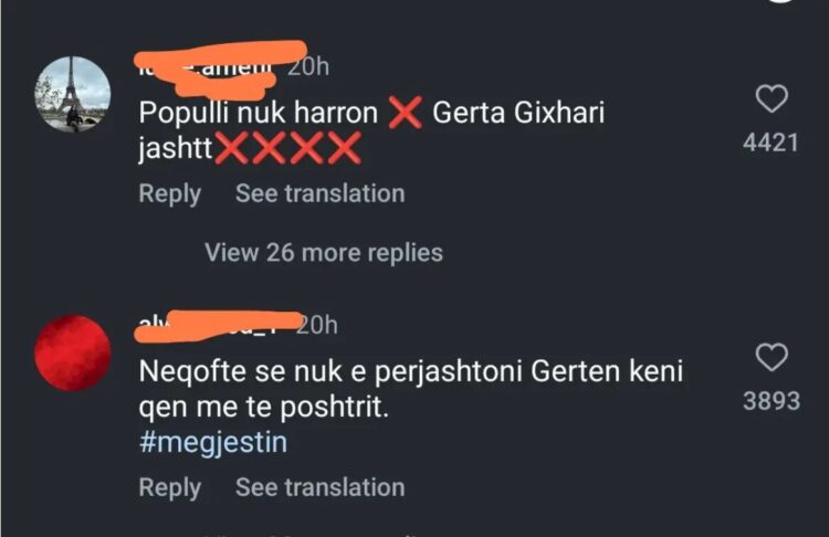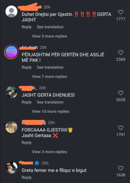 Komentet variojnë nga thirrje si “Populli nuk harron. Gerta jashtë” deri te “Nëse nuk e përjashtoni Gertën, keni për të qenë më të poshtrit” dhe “Drejtësi për Gjestin”.