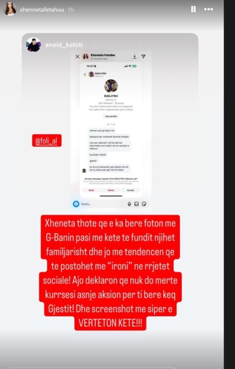 Mesazhet u publikuan nga menaxheri i disa personazheve publikë, Anaid Kaloti ditën sotme pasi rrjeti pati një reagim të fortë për foton që G Bani publikoi krah Xhenetës me një urim për pavarësinë e Kosovës – postim ky që u mor si ironi ndaj Gjestit.