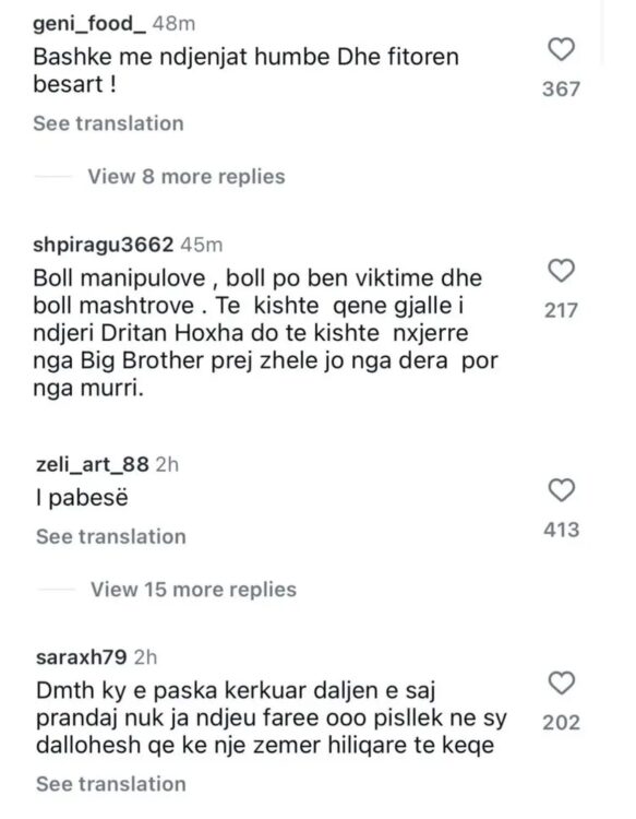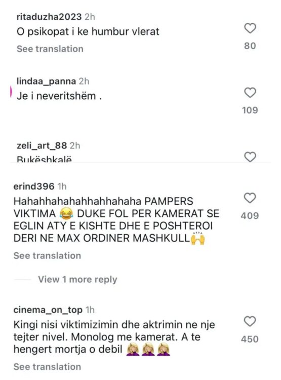 Komentet negative janë përhapur me shpejtësi, ku shumë ndjekës e quajnë manipulues dhe pa ndjenja për mënyrën se si e ka trajtuar Eglin gjatë qëndrimit në shtëpi dhe veçanërisht për qëndrimet e tij pas largimit të saj.