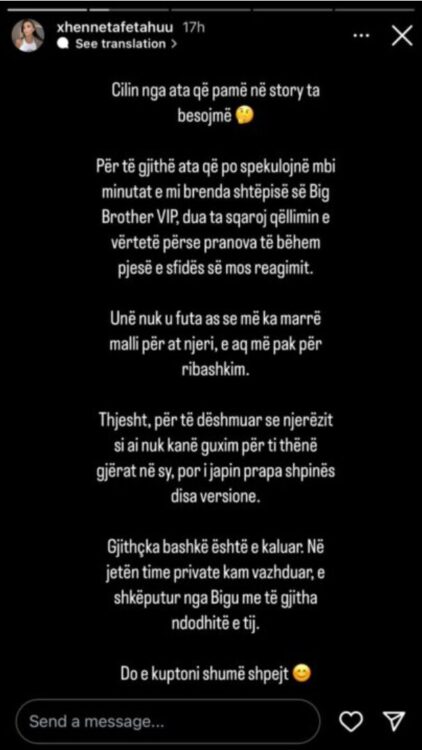 Ish-e dashura e Gjestit, Xheneta Fetahu, ka reaguar përmes një postimi në “Instagram” pas spekulimeve rreth qëllimit të vërtetë të hyrjes së saj në shtëpinë më të famshme në Shqipëri, “Big Brother VIP 4”.