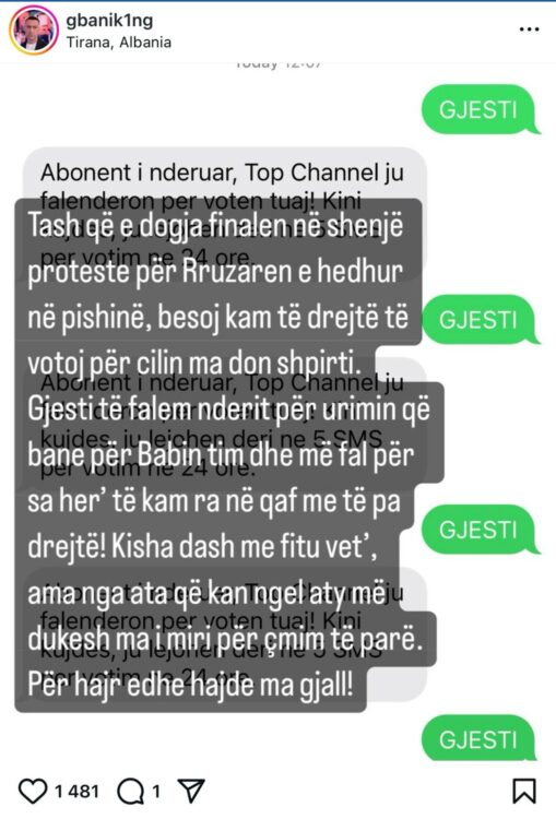 duke shpërndarë një mesazh ku tregon se është duke votuar masivisht për finalistin Gjestin.
