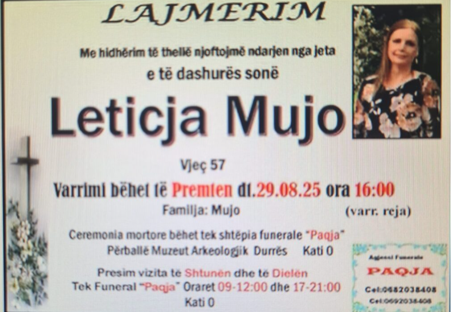 Eshtë ndarë në mënyrë të parakohshme nga jeta, në moshën 57-vjeçare mësuesja Leticja Mujo. Arsimtarja që prej vitesh mësonte breza të tërë nxënësish në një nga shkollat jo publike të qytetit ka humbur jetën si pasojë e një sëmundjeje të rëndë.