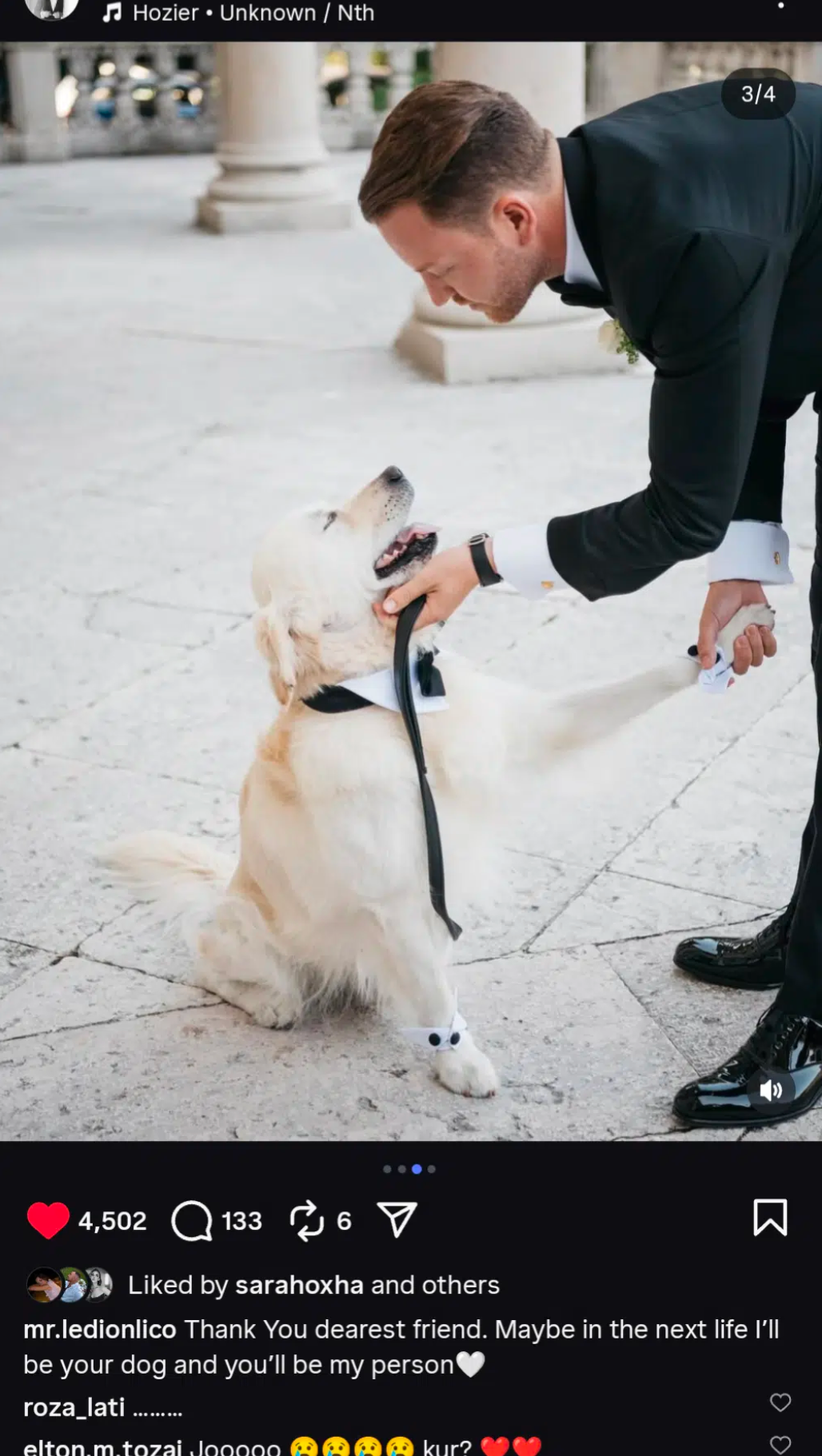 “Faleminderit miku im i dashur. Ndoshta në jetën tjetër unë do të jem qeni yt dhe ti do të jesh personi im.”, shkroi Liço krahas disa fotove të kafshës së tij shtëpiake.
