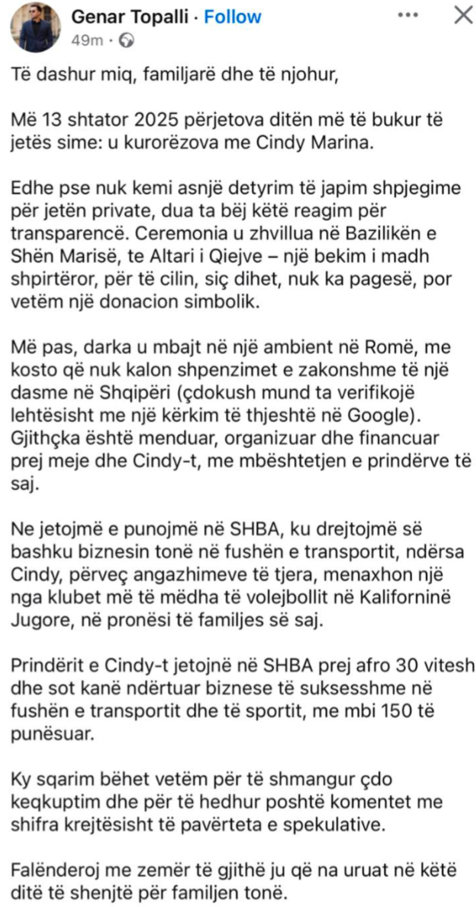 Genar Topalli ka reaguar për herë të parë pas aludimeve mbi dasmën e tij me Cindy Marina, e zhvilluar më 13 shtator në Romë.