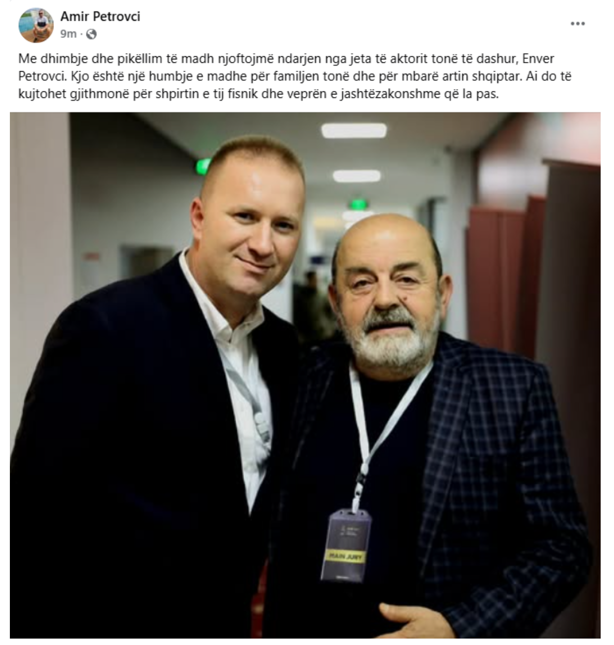“Me dhimbje dhe pikëllim të madh njoftojmë ndarjen nga jeta të aktorit tonë të dashur, Enver Petrovci. Kjo është një humbje e madhe për familjen tonë dhe për mbarë artin shqiptar. Ai do të kujtohet gjithmonë për shpirtin e tij fisnik dhe veprën e jashtëzakonshme që la pas”, thuhet në një postim të një familjari të aktorit.