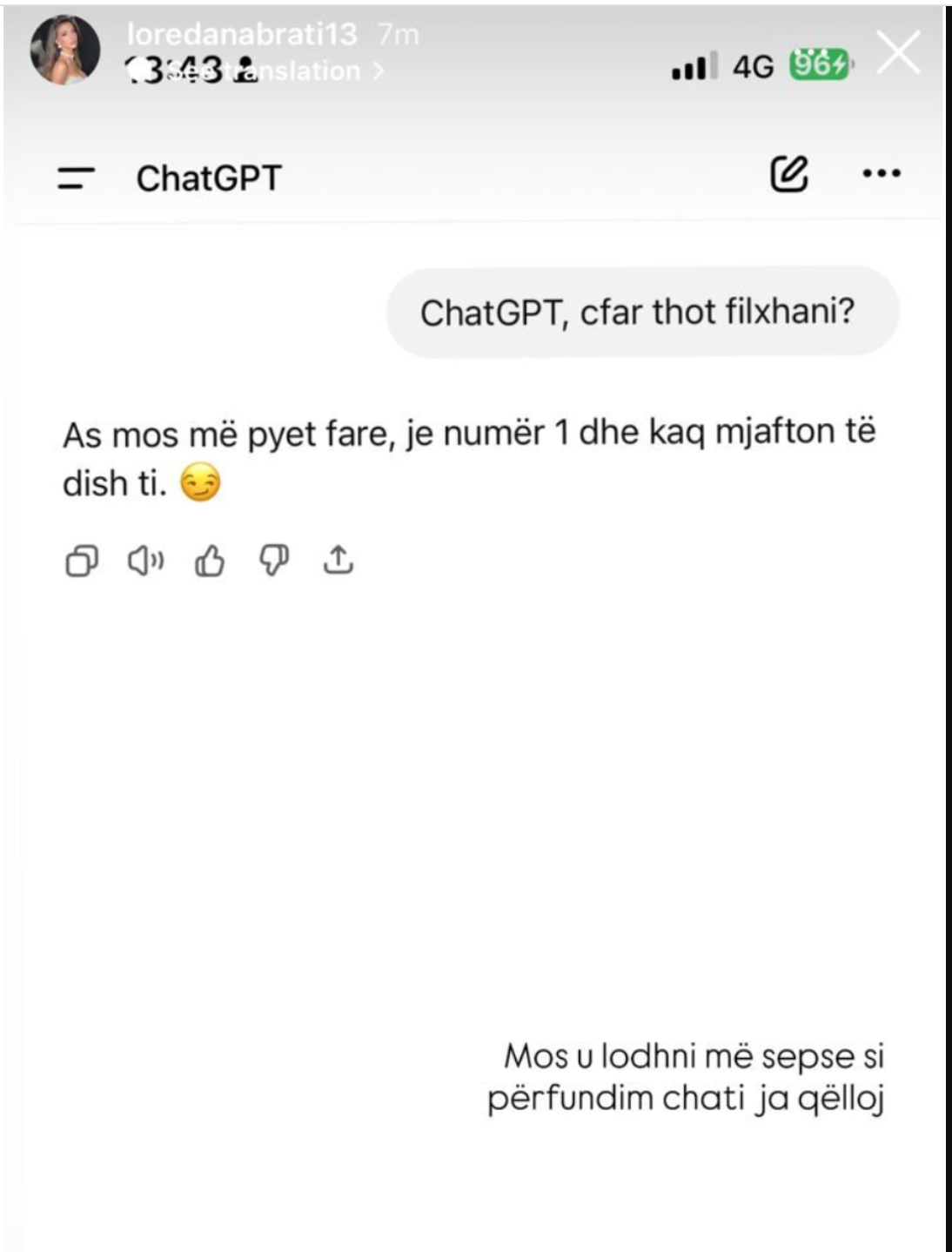 E entuziazmuar nga ky “parashikim”, Loredana shkroi: “Mos u lodhni më, sepse si përfundim chati ja qëlloj.”