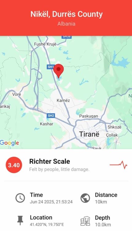 Sipas të dhënave, raportohet se epiqendra e tërmetit ka qenë në fshatin Nikël në Fushë-Krujës, ndërsa lëkundjet me magnitudë 3.4 të shkallës Rihter dhe thellësi fokale 10 kilometra.