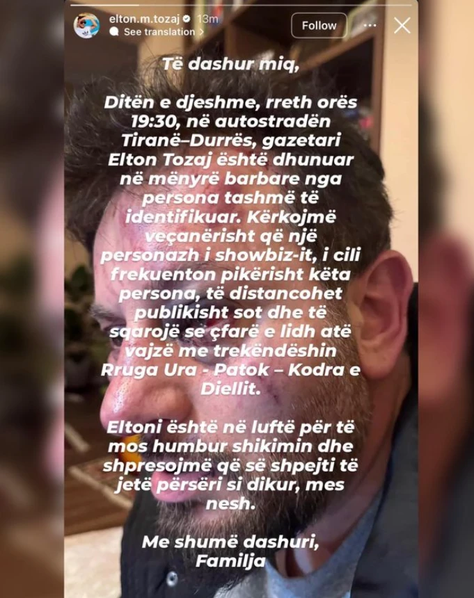 Në një postim në rrjetet sociale, ai ka ndarë një foto ku shihet i dhunuar dhe me shenja në fytyrë nga goditjet.