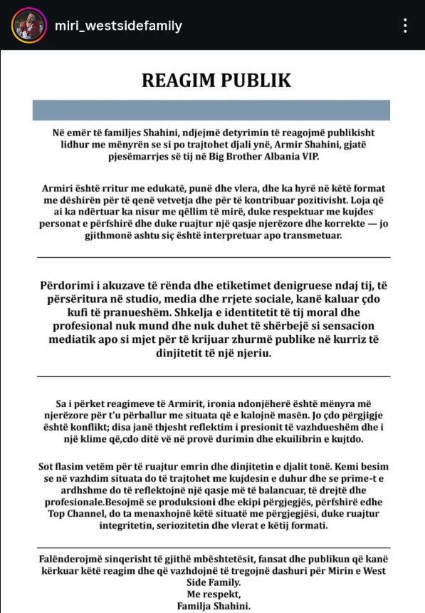 Situata e Armir Shahinit (Mirit) brenda shtëpisë së “Big Brother VIP Albania” dhe debatet e fundit që e kanë përfshirë atë, kanë detyruar familjen e tij të mbajë një qëndrim zyrtar.