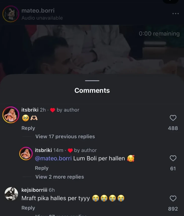 Familja e Brikenës, e cila menaxhon llogarinë e saj, ka reaguar fillimisht me emoji plot dashuri dhe emocione në postimin e Mateos. Por, vëmendjen e ka rrëmbyer motra e Mateos, Kejsi Borri.