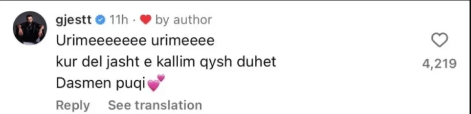 Përmes një komenti në profilin e Instagramit të Gimbos, Gjesti ka treguar mbështetjen e tij duke premtuar një festë akoma më të madhe jashtë.