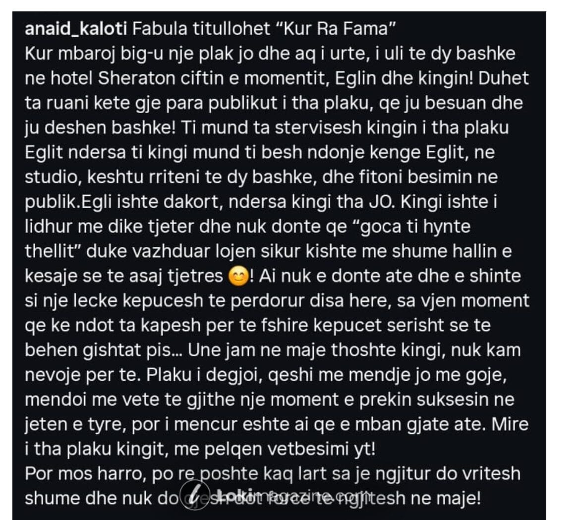 Përmes një postimi të gjatë dhe simbolik me titullin “Kur ra fama”, Kaloti rrëfen një episod që, sipas tij, ndodhi menjëherë pas përfundimit të Big Brother VIP Kosova, ku ai u takua me Eglin dhe Gjestin në një hotel luksoz. “Plaku” në fabul, që i referohet vetes, i kishte dhënë një këshillë çiftit: