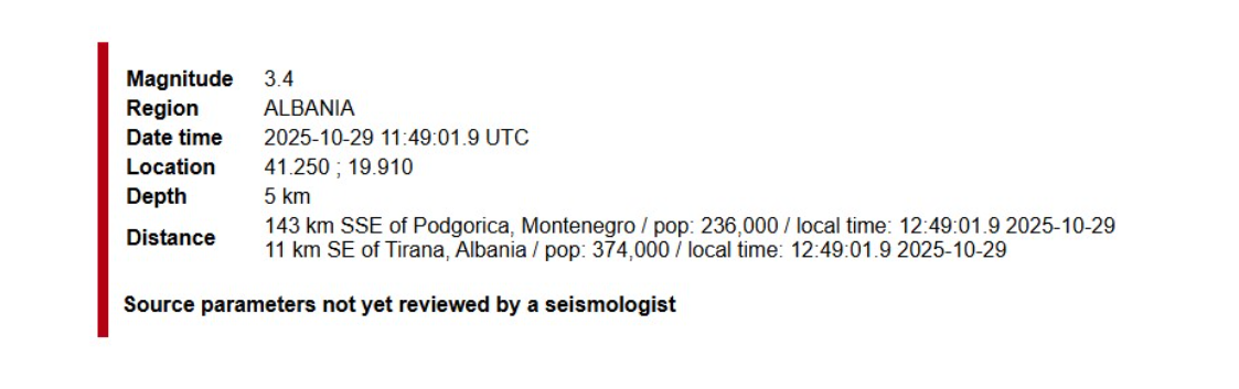 Epiqendra u regjistrua në një distancë 11 kilometra nga jug-lindja e Tiranës.