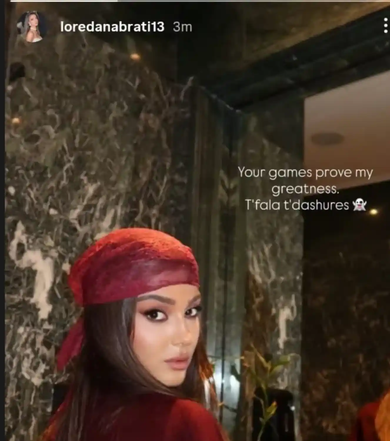 Menjëherë pas këtij thumbi, Loredana Brati ka postuar në Instastory një fotografi të saj, të shoqëruar me një mesazh të qartë dhe të fortë. Ajo shkroi: “Your games prove my greatness. T’fala t’dashures.” (Lojërat e tua provojnë madhështinë time. Të fala të dashurës.)