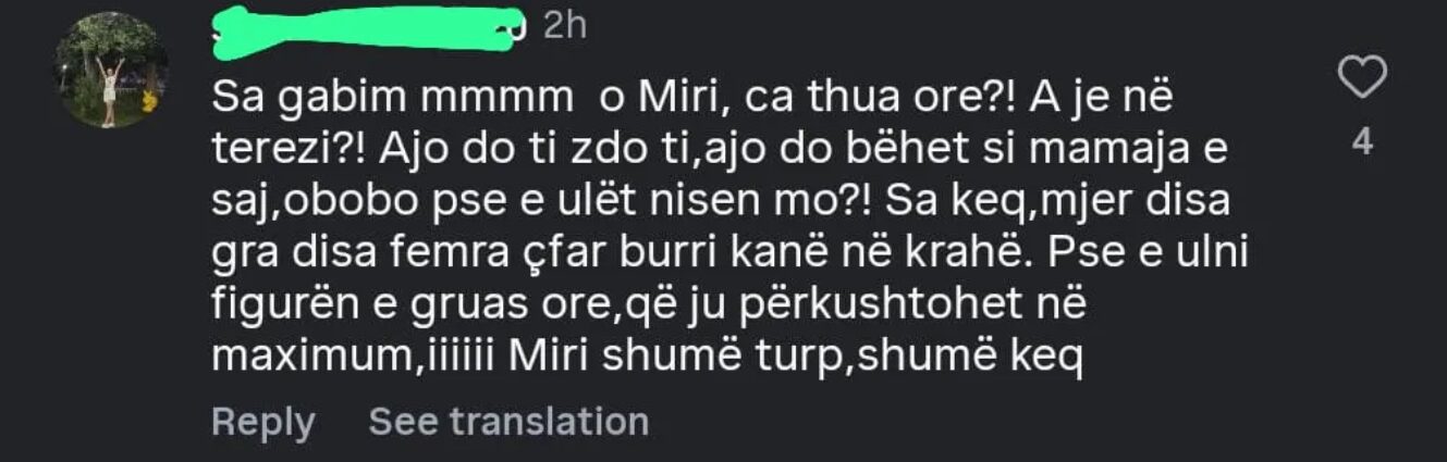 Reagimet kanë qenë të ashpra. Një ndjekëse shkruan e revoltuar: “Sa gabim o Miri, ça thua ore?! A je në terezi?!… Pse e ulni figurën e gruas ore, që ju përkushtohet në maksimum, iiiiii Miri shumë turp, shumë keq”.