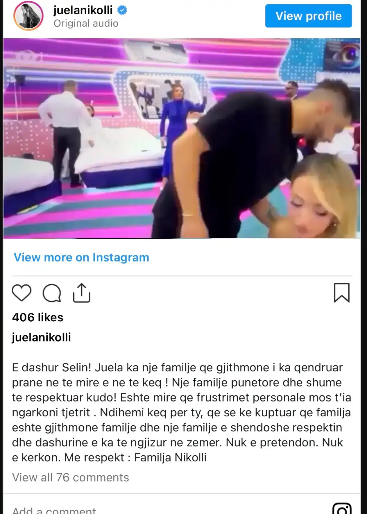 “E dashur Selin! Juela ka një familje që gjithmonë i ka qëndruar pranë në të mirë e në të keq! Një familje punëtore dhe shumë të respektuar kudo! Është mirë që frustrimet personale mos t’ia ngarkosh tjetrit. Ndihemi keq për ty, që se ke kuptuar që familja është gjithmonë familje dhe një familje e shëndoshë respektin dhe dashurinë e ka të ngjizur në zemër. Nuk e pretendon. Nuk e kërkon. Me respekt: Familja Nikolli”, shkruajnë familjarët e banores së shtëpisë më të famshme në Shqipëri.