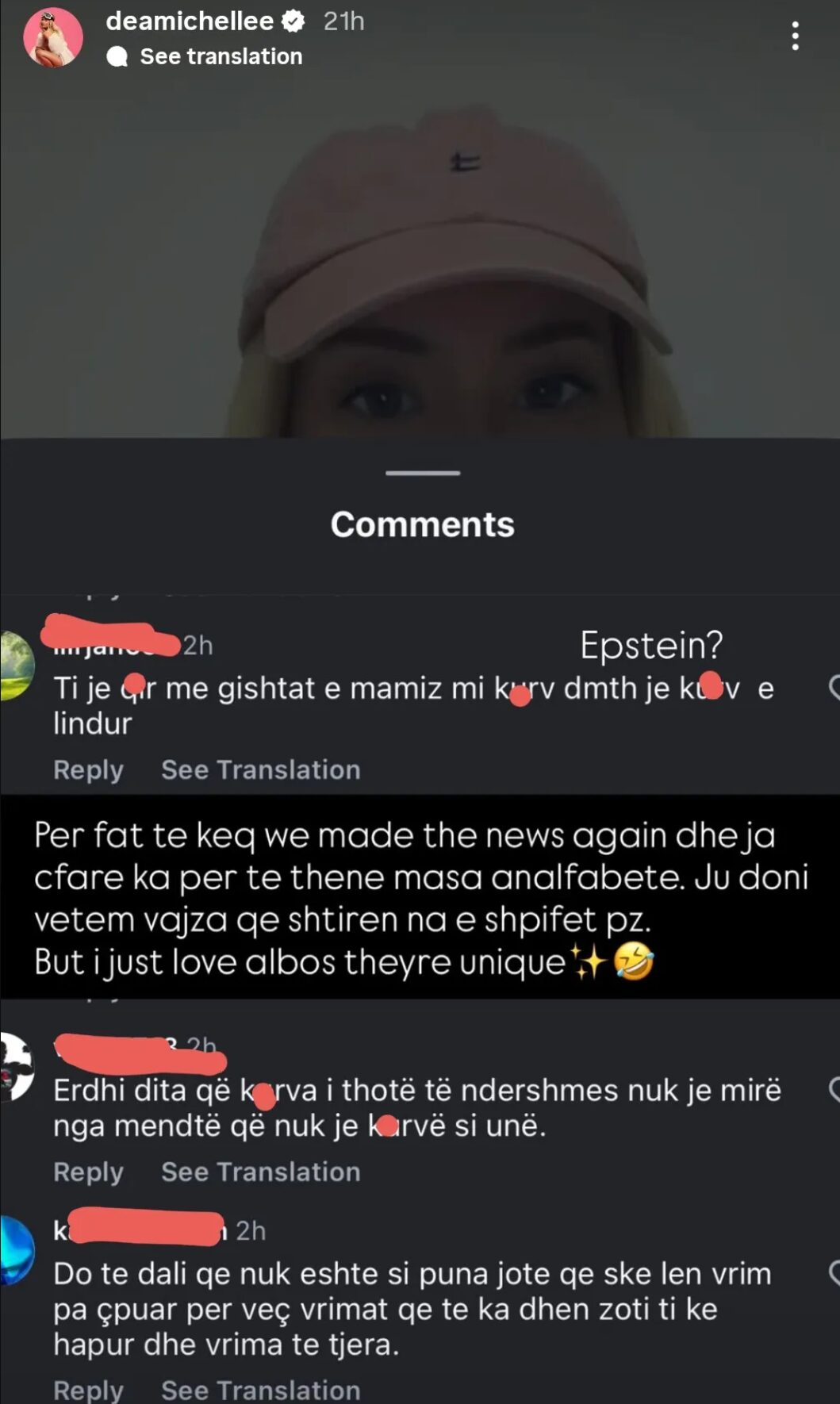 Në një postim në InstaStory, ajo publikoi disa komente tepër ofenduese që kishte marrë në një nga postimet e saj, të cilat përmbanin gjuhë të rëndë dhe sulme personale. Për shkak të përmbajtjes së papërshtatshme, disa nga fjalët janë censuruar.