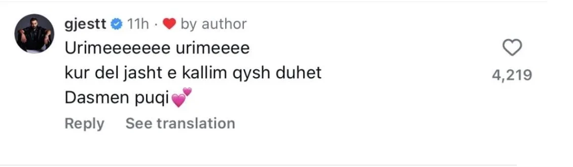 Përmes një komenti në profilin e Instagramit të Gimbos, Gjesti ka treguar mbështetjen e tij duke premtuar një festë akoma më të madhe jashtë.