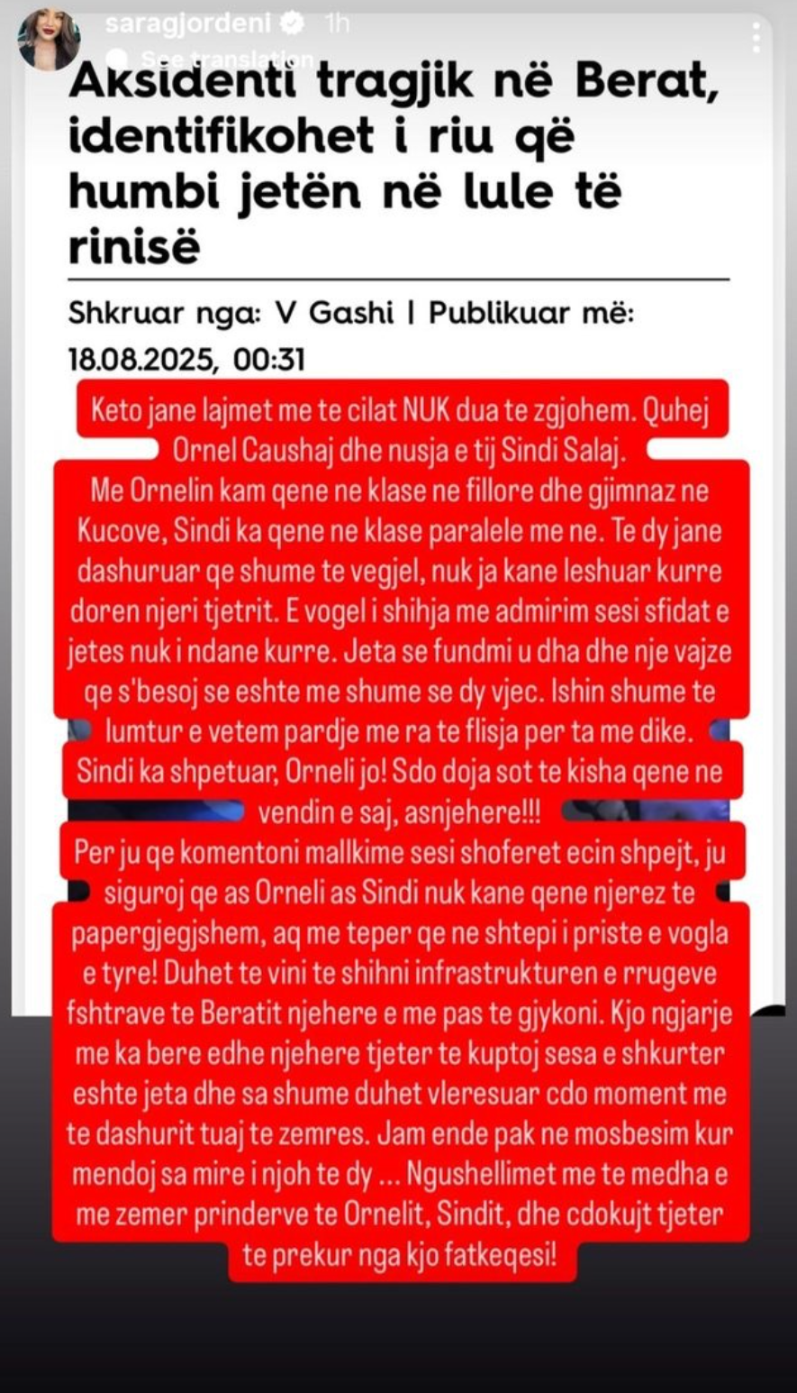 Në postimin e saj, Gjordeni u ndal edhe te kritikat për ata që paragjykojnë ngjarje të tilla si pasojë e shpejtësisë së shoferëve. Ajo theksoi se Orneli dhe Sindi nuk ishin njerëz të papërgjegjshëm, por përkundrazi, ishin prindër të kujdesshëm që jetonin për vajzën e tyre të vogël. Sara shtoi se kjo tragjedi është një thirrje për të vlerësuar më shumë çdo moment pranë të dashurve tanë.