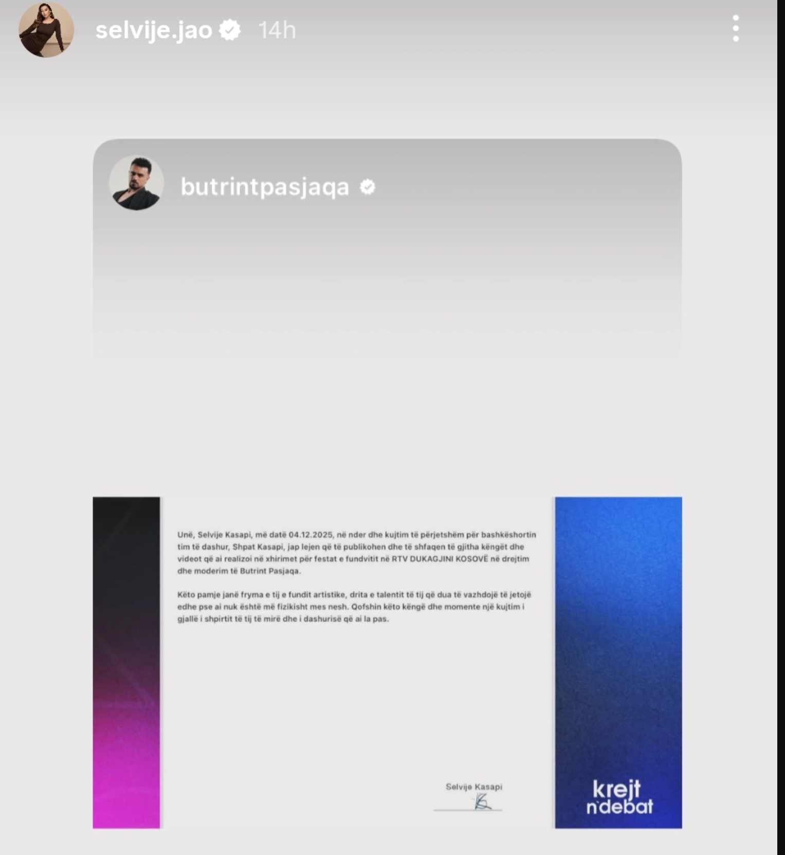 Në deklaratën e firmosur prej saj drejtuar RTV Dukagjinit dhe producentit Butrint Pasjaqa, Selvije shprehet me fjalë prekëse: